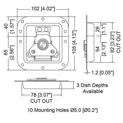 This butterfly latch measures 105x102mm and is located in a 10mm plain dish. The butterfly latch has been made out of steel with a zinc finish. As regards fixing the dish has been provided with ten pre-punched 5mm holes.